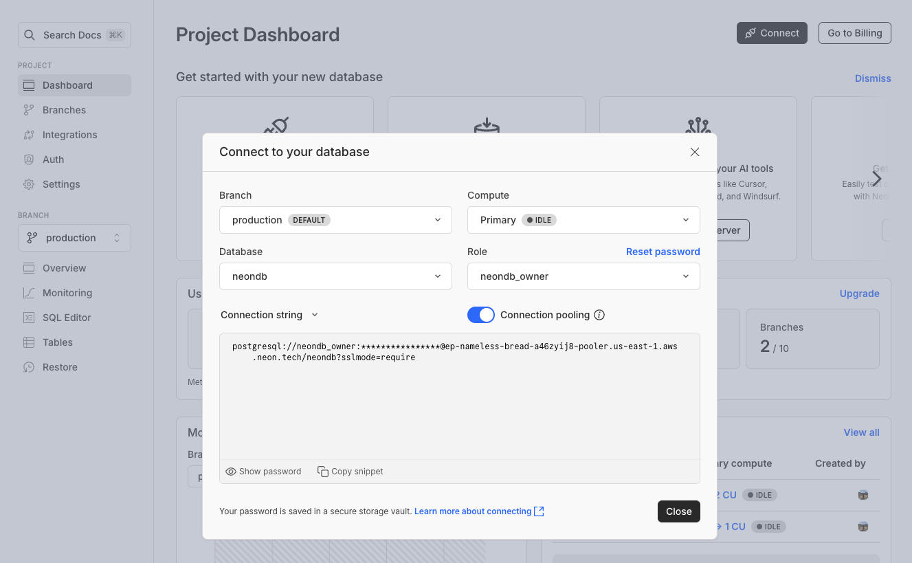 우선 Neon 콘솔의 생성한 프로젝트 대쉬보드에서 상단의 Connect 버튼을 클릭 후 Connection String 값을 복사해주어 env