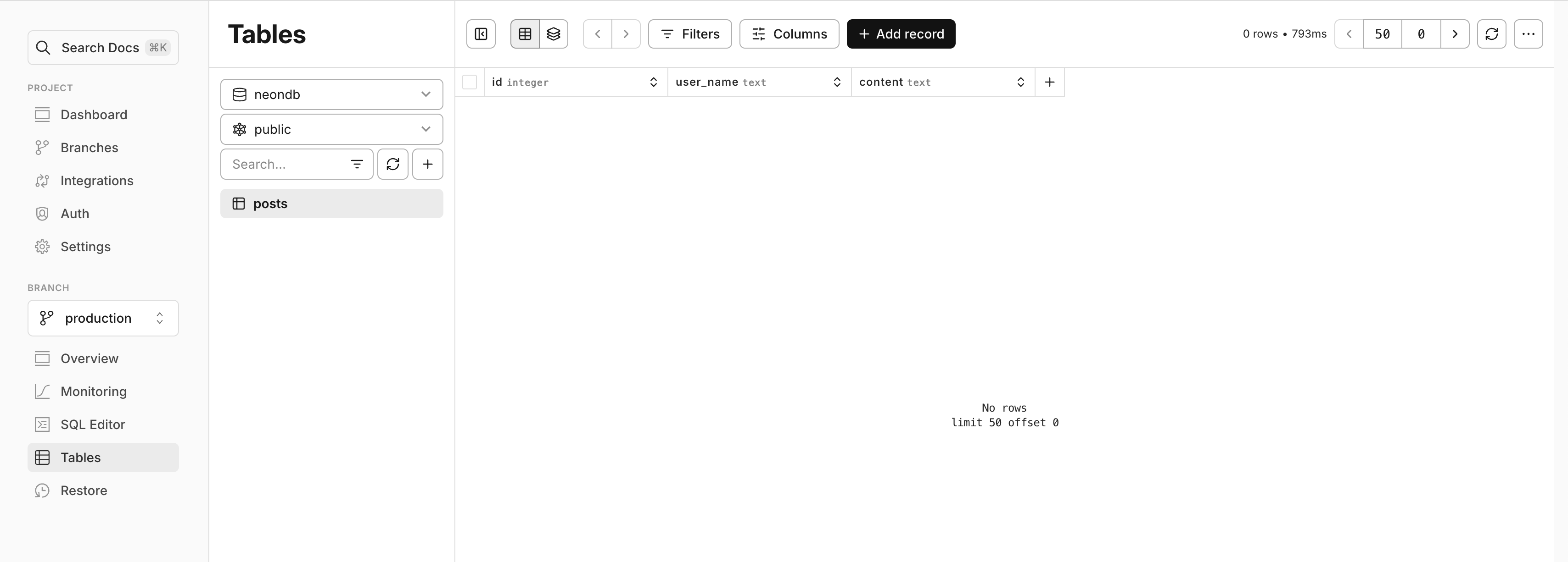 다시 Neon 데이터베이스에 만들어둔 프로젝트 대시보드로 들어가보면 정의한 posts