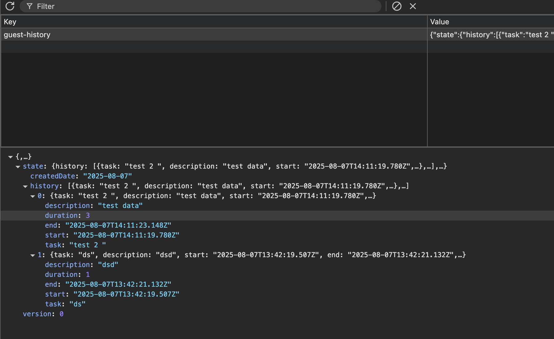 실제로 데이터를 추가하고 브라우저의 session storage를 확인해보면 지정해준 key값을 가진 전역 상태가 웹 storage에 추가된것을 확인할 수 있었습니다.